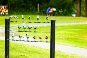 The Birds on a Wire sculpture allows visitors to rearrange the bird by rotating them and sliding them back and forth. Each bird is painted in strong colors on one side and in shades of gray on the other.